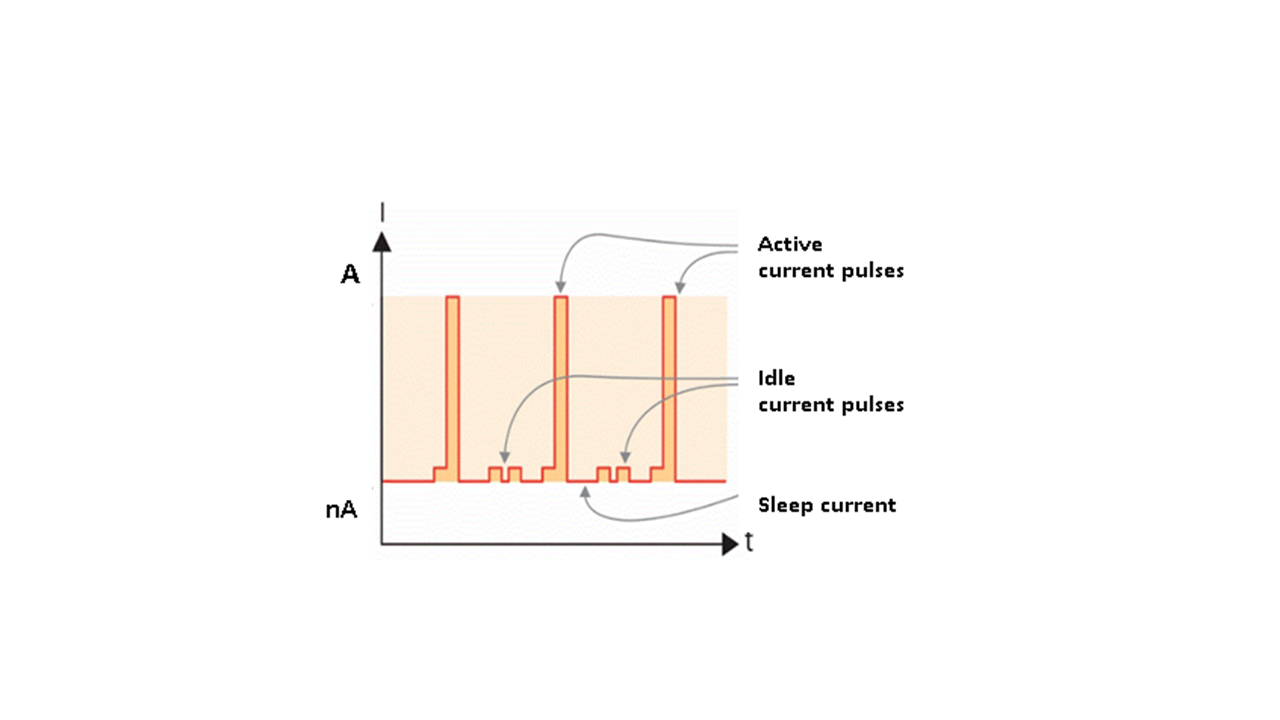 While the network must support the successors to today’s smartphones and tablets and their data-hungry applications, some researchers are also concerned with the other end of the device spectrum – the battery powered sensors and actuators for the IoT; simple devices that transmit very little data, and are designed to have an unattended operating life of years. Designing and developing this type of device requires specific tools that can measure battery drain under three main conditions: “sleep mode”, when the device is completely inactive; “idle mode”, when the device is active but not transmitting; and “transmit mode”, when it is sending data. Current consumption for these devices is random in nature, and ranges from nano-amps in sleep mode to milli-amps in idle and amps in transmit, over a very short time with very steep rise and fall times (Figure 2).