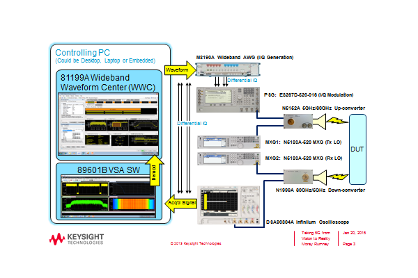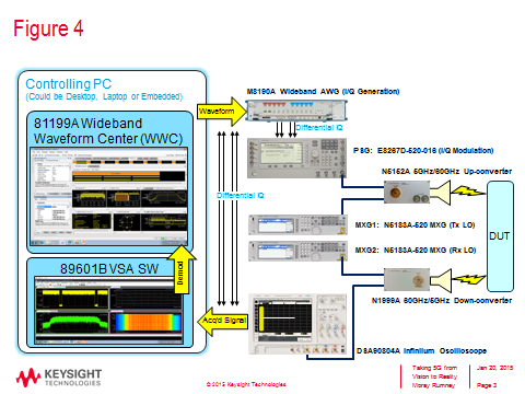 Investigating how wideband transmissions at these new frequencies behave in “real life” requires new tools for generating and analyzing them. Some of the experience of developing components for 802.11ad Wireless LAN is feeding into this development. See Figure 4 for an example of a 60 GHz test bed for analyzing 2 GHz BW signals.