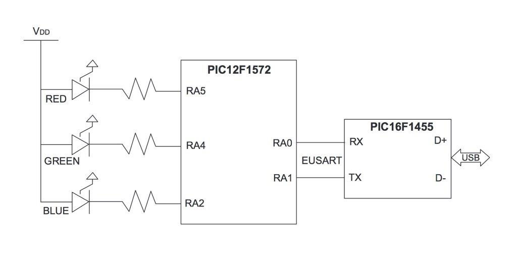 The board has been designed to demonstrate a range of colours that appear on the chromaticity chart. These are converted to RGB values, which are colour-mixed to create the resultant colour. Individual LEDs of red, green and blue colours have their duty cycle or brightness controlled through the PWM peripherals. Each individual PWM has 16 bits of resolution, allowing for smooth colour transitions even with very low duty cycles.