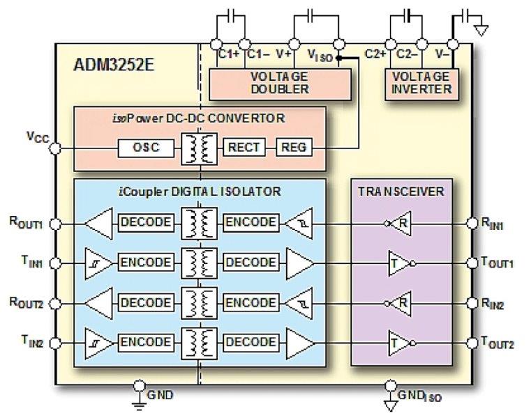 Digital isolators using iCoupler technology offer high levels of robustness for galvanic isolation, with lower power requirements than opto-couplers and enhanced reliability. Other IC functionality (e.g.transceivers) can be integrated into single-chip solutions requiring little extra PCB area compared to non-isolated solutions. This is a particular advantage for isolating RS-232 or RS-485 interfaceswhere an IC is already required to transmit and receive at the appropriate voltages.