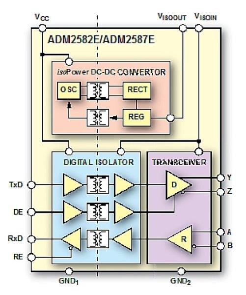 RS-485 also requires a transceiver to interface with either a two wire bus (A and B) or four wire bus (A, B, Y and Z). The signals to be isolated are transmit (TxD), receive (RxD), driver enable (DE) and receiver enable (/RE). Similar to the RS-232 solution, the ADM2587E provides a fully isolated RS- 485 interface as shown in Figure 3, including the integrated isoPower DC-DC converter required to power the transceiver side of the device. The transceiver can also be used for RS-422 communication.