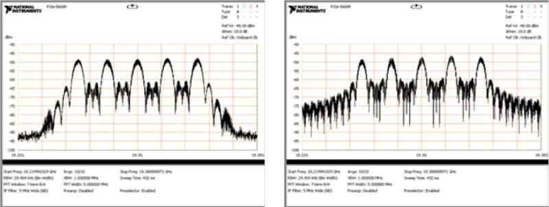 Figure 8 compares the measured spectral efficiency due to the Kaiser windowing of the pulse envelope. The windowed version shows nearly a 20 dB improvement in the adjacent channel.