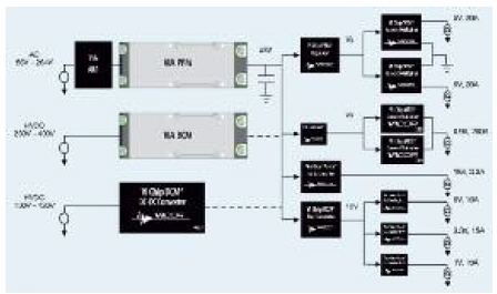 Vicor’s product range supports a component-based design technique for the development of such high-performance power supplies, allowing the designer to optimise them for each specific end product. The Vicor range of power components (normally housed in small, low-profile packages similar to electronic components) addresses the entire power chain from the mains source to the point-of-load (PoL). Vicor front-end modules, intermediate-stage converters and PoL DC-DC converters may be successfully used in applications with loads ranging between 25W at the low end and 1kW at the high end. A complete source-to-PoL power chain can be quickly developed from the Vicor range of power components. System designers benefit particularly from the Vicor component approach to their power-supply design when their requirement is for one or more of the following