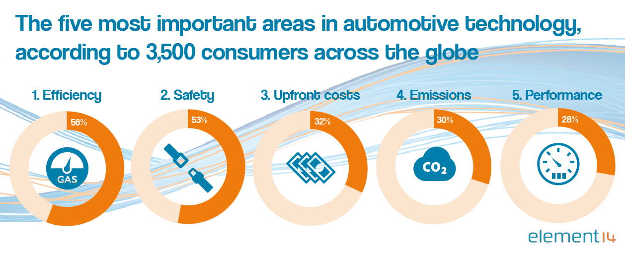 Improving efficiency and passenger safety should be the top areas addressed by engineering and technology developments in the automotive sector, according to global consumer research from element14. In contrast, areas that are seeing significant funding and development, such as sensors, self-driving cars and electric vehicles, have considerably less consumer appeal.