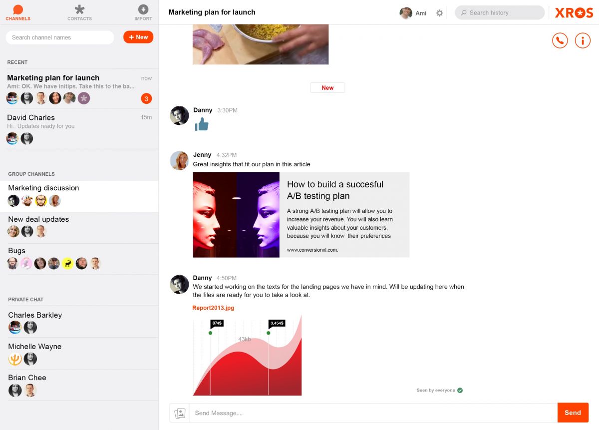 With XROS, all your contacts can join discussion channels instantly, without downloading an app or even registering an account. When a contact is added to a channel, they simply get a link, click it, and they’re in. Simple. No Downloads. No registrations. The recipient has immediate access to the channel’s entire history, getting them quickly up to speed.