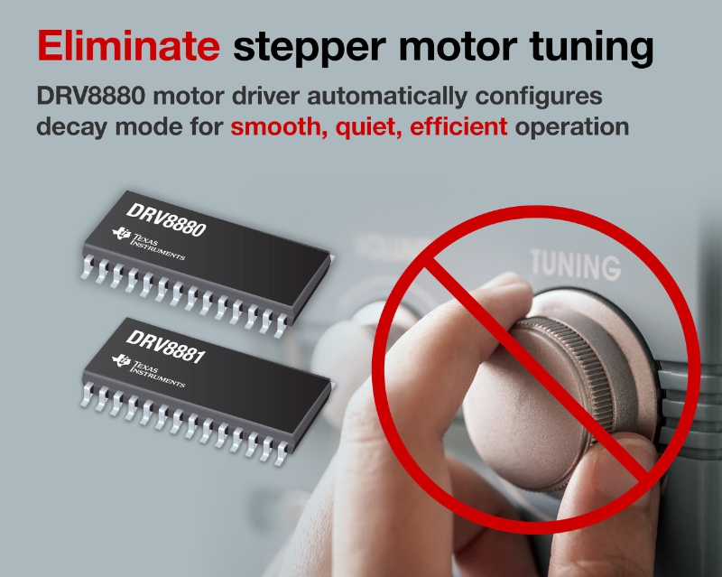 Texas Instruments (TI) (NASDAQ: TXN) today enhanced its high-performance stepper motor-driver family with three new devices for 24-V stepper motors. Two devices offer TI’s patented AutoTune™ technology to eliminate stepper motor tuning and two integrate current sensing to support differentiated 3D printers, robotics, factory automation equipment, currency-counting machines and more. Learn more or order samples at www.ti.com/drv8880-pr.