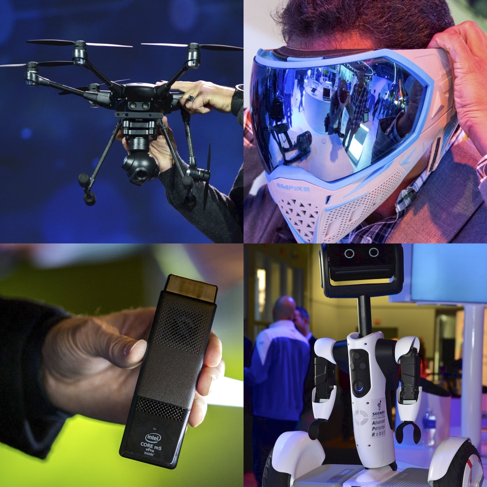 Intel technologies, products and partners received top awards during last week’s CES 2016. Clockwise from upper left: Engadget, PC Magazine and Videomaker named theIntel® Atom™ processor-powered Yuneec Typhoon H withIntel® RealSense™ technology the best drone of CES 2016. Engadget recognized the Empire EVS*, based on Recon’s Snow2 heads-up display (HUD) technology, as the best wearable. Recon Instruments, an Intel company, enabled Empire Paintball* to create a smart paintball mask that allows users to access live tactical information with a glance.PBS, Reuters and Wired included the Ninebot* Segway* robot, which is powered by an Intel Atom processor and uses Intel® RealSense™ technology, in their best-of-CES roundups. Intel’s new Compute Stick, powered by the 6th Generation Intel Core M processor or the latest quad-core Intel Atom processor, received the Editors’ Choice Award from USA Today’s Reviewed.com as well asComputer Shopper’s Best of CES. CES 2016, the leading forum for the world’s consumer technology leaders, ran Jan. 5-9, 2016, in Las Vegas. (Credit: Intel Corp.)