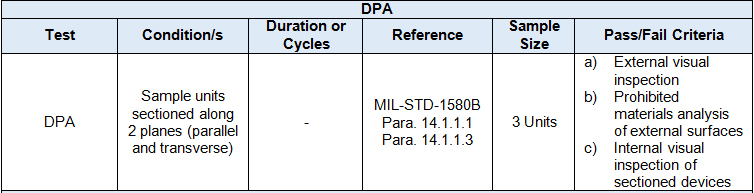 2. Reliability TestingPrior to starting reliability testing, DPA is performed on 3 randomly selected sample units to verify the construction and termination composition on the lot to be used for production. MIL-STD-1580B is used to establish a general process for performing DPA on the units under test, but because pass/fail criteria for LTCC unites are not defined by the standard, it is used as a guideline, and the units under test are compared to determine if there are any apparent anomalies. The DPA pass/fail criteria are summarized in Table 1.