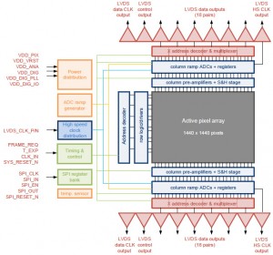Besides its high full-well capacity the CSI2100 achieves high frame rates up to 500fps by integrating 35 LVDS (Low voltage Differential Signaling) outputs. Dark noise, mainly caused by ADC quantization noise, is held to 945e-. Dynamic range is 66dB. The chip, housed in a small µBGA package with 173 pins, has a power consumption of just 2 watts (Figure 3).