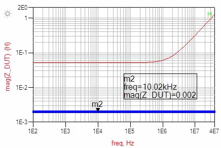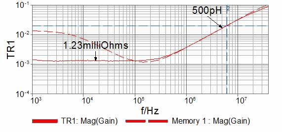 By way of example, the simulation result of the 2mOhm case is shown in Figure 3, while sample measurements of 1 and 2 mOhm parts are shown in Figures 4 and 5, with and without the J2102A common mode transformer inserted. In order to quantify the significance, the approximate error is the parallel ground braid resistance divided by the DUT.  For instance, a 5% error would occur at a DUT value of 1Ω as the parallel ground resistance is 50mΩ or 5% of 1Ω.