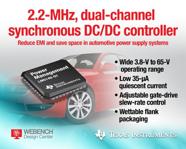 Texas Instruments (TI) (NASDAQ: TXN) today introduced a 2.2-MHz, dual-channel synchronous buck converter with a unique set of features designed to significantly reduce electromagnetic interference (EMI) and high-frequency noise in high-voltage DC/DC step-down applications such as automotive infotainment and high-end cluster power-supply systems. The LM5140-Q1 controller includes dual outputs with phase interleaving and is offered in wettable flank packaging that speeds manufacturing. Together with TI’s WEBENCH® Automotive Design tool, the LM5140-Q1 enables engineers to get their automotive designs to market faster. For more information, samples and an evaluation module, see www.ti.com/lm5140q1-pr-eu.