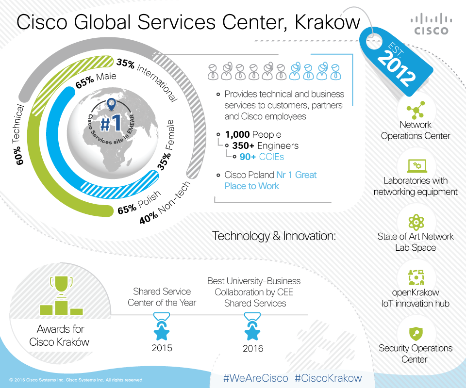 The Cisco Global Services Center in Krakow provides technical and business services to customers, partners and Cisco employees across multiple functional groups, including Consulting and Technical Services, Cloud and Managed Services, Finance and Operations. The center is part of a network of operations located around the globe and focuses on Europe, the Middle East, Africa and Russia. Approximately 1,000 people work at the center currently.