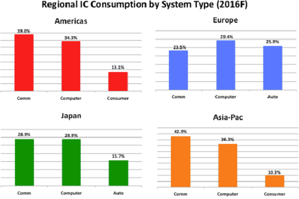 Collectively, communications, computers, and consumer systems are projected to account for 86.4% of IC sales in the Americas this year (an increase of half a percentage point from 2015) and 89.5% in Asia-Pacific (a decrease of half a percentage point from 2015). This year, communications, computer, and automotive applications are forecast to represent 73.5% of IC sales in Japan and 78.8% of IC sales in Europe, the same percentage as in 2015.