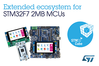 STMicroelectronics has released entry-level, mid-range, and high-end development boards for the latest members of its STM32F7 microcontroller series , which are now entering volume production with up to 2Mbyte of on-chip Flash memory and peripherals that help create rich user interfaces.