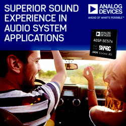nalog Devices, Inc. (ADI) today announced the addition of ADSP-SC57x and ADSP-2157x processors to its growing series of single-chip multicore SHARC processors. The devices advance the audio experience by enabling superior sound quality and more cost-effective and reliable audio systems. The new processor platform meets automotive temperature ranges without the need for costly, bulky heat sinks or fans, which saves space in the end application. By combining ADI’s SHARC technology with ARM® Cortex-A5 system control capability, the series provides a high performance, low cost solution for complex applications such as Dolby Atmos®, DTS:X® or active noise cancellation with performance headroom remaining for further audio post-processing. Target applications include automotive premium audio, consumer and pro-audio, and industrial systems that require high floating-point performance. With more than 2MBytes of on-chip memory, designers are able to realize higher DSP performance at lower power while reducing system complexity, time to market, board space, and cost.
