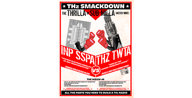 In one corner is the Solid State Power Amplifier (SSPA), which in 2014 was certified by Guinness World Records as the world’s fastest solid state chip, able to operate at THz speeds. This device, made of the semiconductor indium phosphide (InP), also can boost the power of a wide swath of incoming signals some thirtyfold (that’s what the “15 dB GAIN” spec in the poster indicates). In the other corner is a micromachined Traveling Wave Tube Amplifier (TWTA), a miniaturized device that relies on a tiny vacuum chamber in which electrons and radio signals interact. This wee bruiser can boost the power of a narrower range of THz frequencies by a factor of about 200 and was a celebrated darling of the 2016 IEEE International Vacuum Electronics Conference.