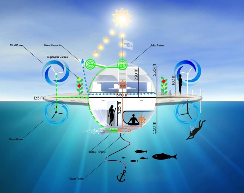 UFO is a living floating house which can move around the world with leisurely maximum speed of 3.5 knots (6.5 km/h, 4 mph), using a waterjet-propelled Torqeedo Deep Blue 1800 electric motor.