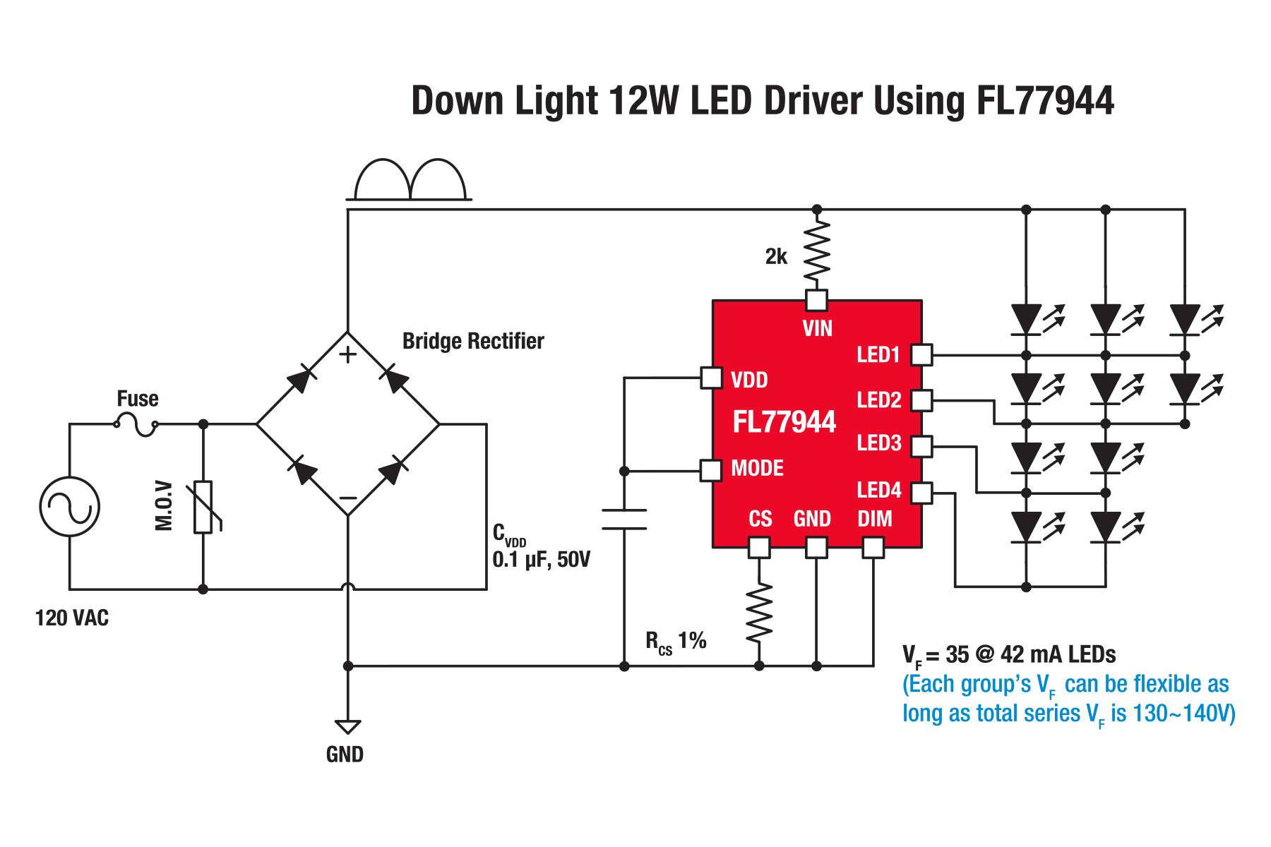- Scaling for higher power applications. The Fairchild FL77944 can scale upwards to suit higher power applications well above 120W. This is simply done by wiring products in parallel. It also reduces the number of different ICs that lighting manufacturers need to keep in inventory.