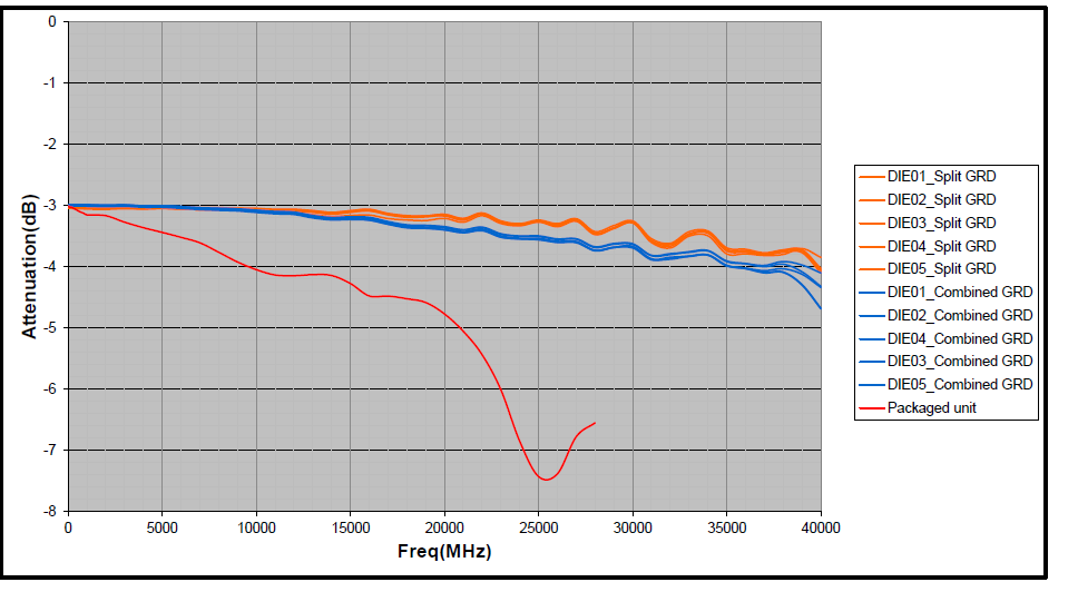 Capacitive reactance becomes smaller and smaller as frequency increases above 26.5 GHz, and the attenuator becomes increasingly sensitive to the capacitance between the die and ground plane at high frequency. This effect is primarily what limits the frequency range of the attenuator die. Reducing the capacitance between the die and the ground plane, however, would expand performance to higher frequencies.
