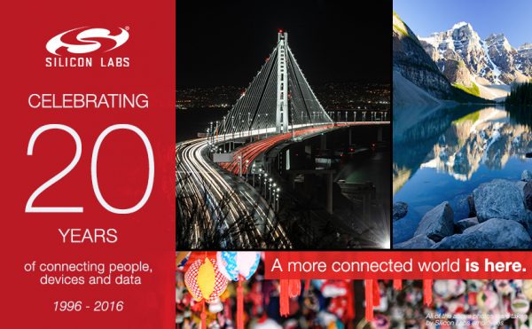 AUSTIN, Texas – Aug. 18, 2016 – Silicon Labs (NASDAQ: SLAB), a leading provider of silicon, software and solutions for a smarter, more connected world, celebrates its 20th anniversary today. Over the last two decades, the company has evolved from a semiconductor start-up committed to helping developers reduce the cost, size and complexity of their system designs into a global leader in energy-friendly connectivity solutions for the Internet of Things (IoT). Silicon Labs has shipped more than 7 billion devices to date, holds more than 1,500 patents and employs 1,200 people around the globe. .