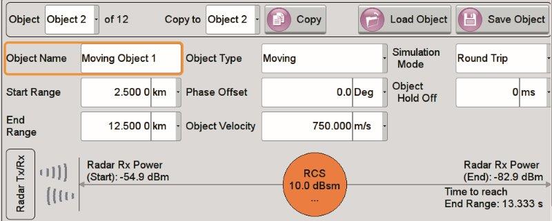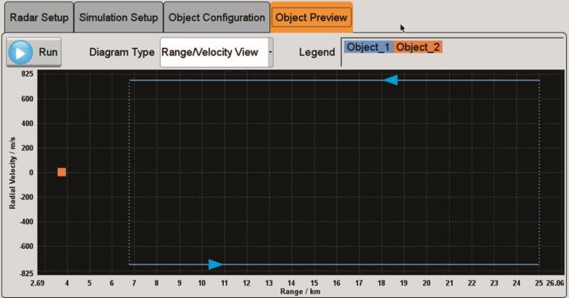 For moving objects, the velocity and the start and end range to the radar can be specified (Fig. 2, bottom). The objects can be assigned a movement pattern, e. g. a one-way path from the start to the end location or continuous movement between the start and end location. Superposition of echoes can easily be simulated by mixing static and moving objects.