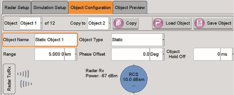 The top section of Fig. 2 shows the menu for defining the objects used to create the echo signal. Static objects are assigned a specific range. Their size can be defined via the radar cross section (RCS). The R&S®SMW-K78 option models the point objects with a constant RCS, which is often called “­Swerling 0” after the underlying RCS statistic.