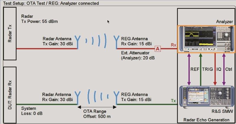 For conducted tests, the radar signal is fed to the R&S®FSW via a cable. It is then downconverted, digitized in realtime and fed to the R&S®SMW200A (Fig. 3, top). The generator uses this signal to generate echo signals that are indistinguishable from real echoes. For OTA tests, the signals are received and transmitted by antennas that are connected to the input port of the analyzer and to the output port of the generator (Fig. 3, bottom).