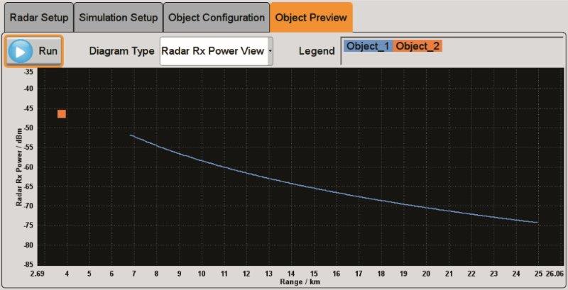 The software offers the option of manually configuring the radar receive level or using the radar equation to automatically calculate it based on the radar scenario. Fig. 4 shows all parameters (except the object properties and center frequency) that must be set in order to use the radar equation to automatically calculate the signal power level at the receiver.