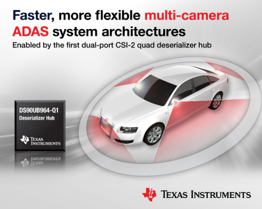 DALLAS (October 18, 2016) – Texas Instruments (TI) (NASDAQ: TXN) today introduced the industry’s first dual-port quad deserializer hub that is compliant with the MIPI Camera Serial Interface 2 (CSI-2) specification. The new automotive-qualified hub simultaneously aggregates and replicates high-resolution data from up to four cameras. High data throughput and precision are essential in autonomous driving and sensor fusion-based advanced driver assistance systems (ADAS), including surround-view systems, rearview cameras, driver-monitor cameras, camera-monitor systems, front camera systems and satellite radar equipment. For more information, see www.ti.com/DS90UB964q1-pr-eu.