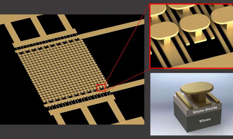 To address this challenge, Sievenpiper’s team fabricated a microscale device that can release electrons from a material without such extreme requirements. The device consists of an engineered surface, called a metasurface, on top of a silicon wafer, with a layer of silicon dioxide in between. The metasurface consists of an array of gold mushroom-like nanostructures on an array of parallel gold strips.