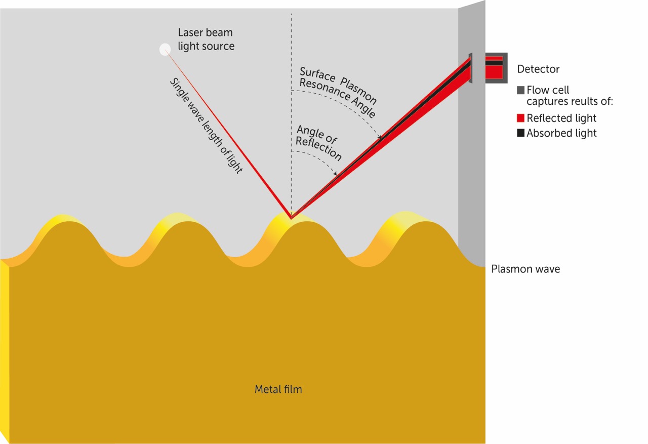 SPR occurs when polarized beams of light hit a metal film at the interface of two media. A charge density oscillation of free electrons (or “surface plasmons”) at the metal film occurs, reducing the intensity of reflected light. The scale of the reduction depends on the substance on the metal at the interface. Information then gathered from the refracted can then be analysed, and a pre-programmed pathogen confirmed, resulting in an unambiguous detection of the bacteria in situ.
