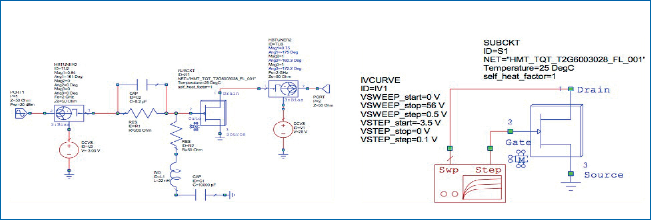 - Figure 1: Initial load-line analysis and harmonic impedance tuning. Left side is the schematic to bias and stabilize transistor and right is the IV curve simulation schematic