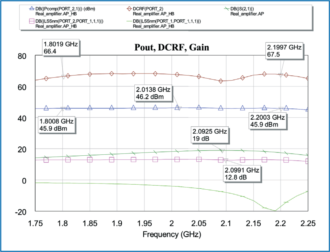 Once the matching networks were in Microwave Office, Modelithics models were substituted for the surface-mount lumped-element models used in ADW. Final linear, HB, EM, and DC simulations were then performed in Microwave Office to fine tune the design. The described design process typically eliminates the need for optimization.