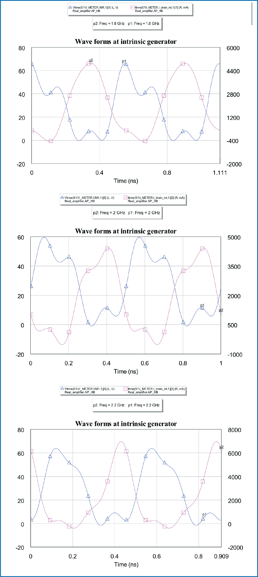 - Figure 13: Simulated intrinsic device channel voltage and current wave forms at 1.8 GHz (top), 2 GHz (center), and 2.2 GHz (bottom).