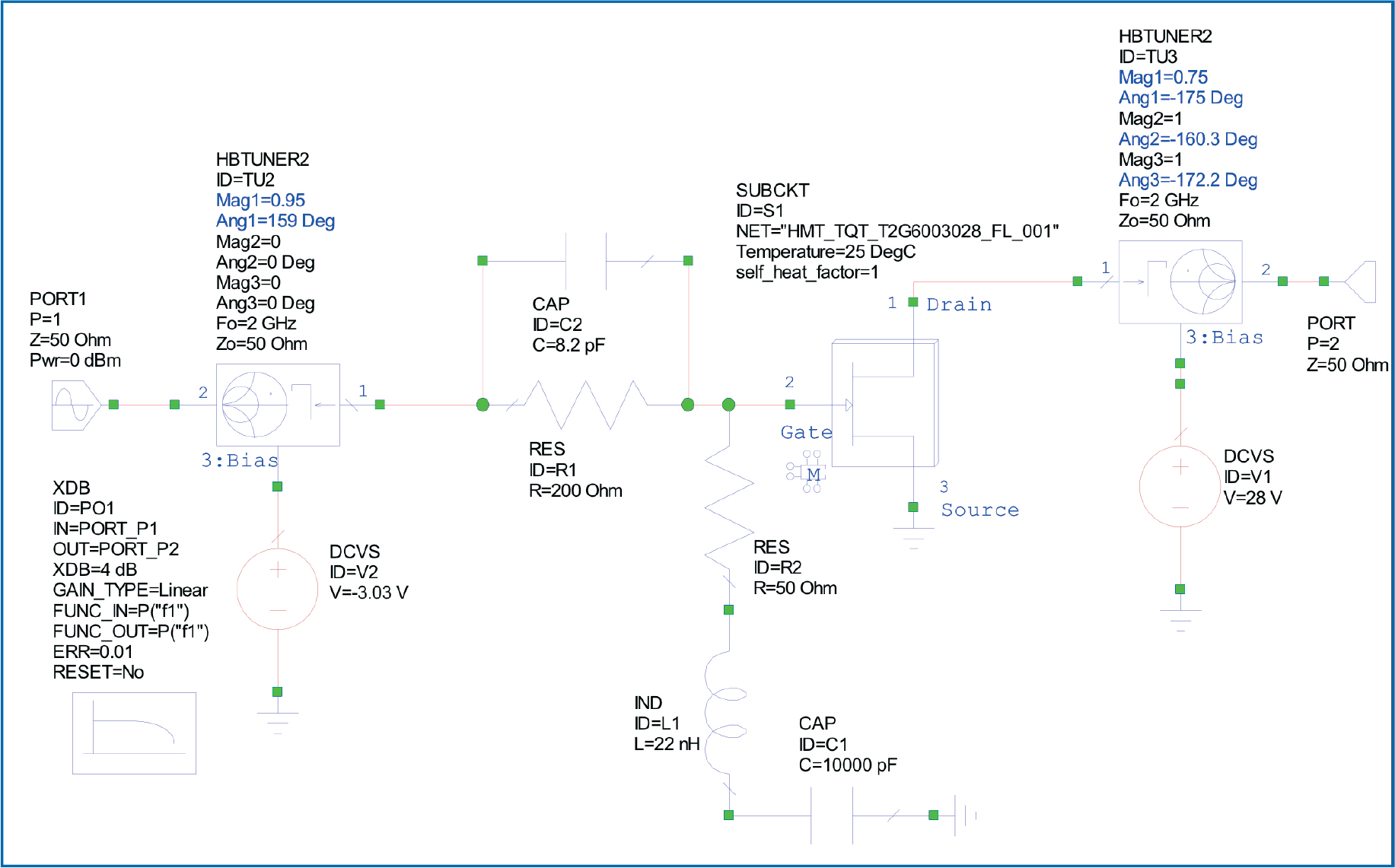 Notice that the schematic is identical to that of Figure 1, however, the input and output impedances have been updated and the XDB component has been added.