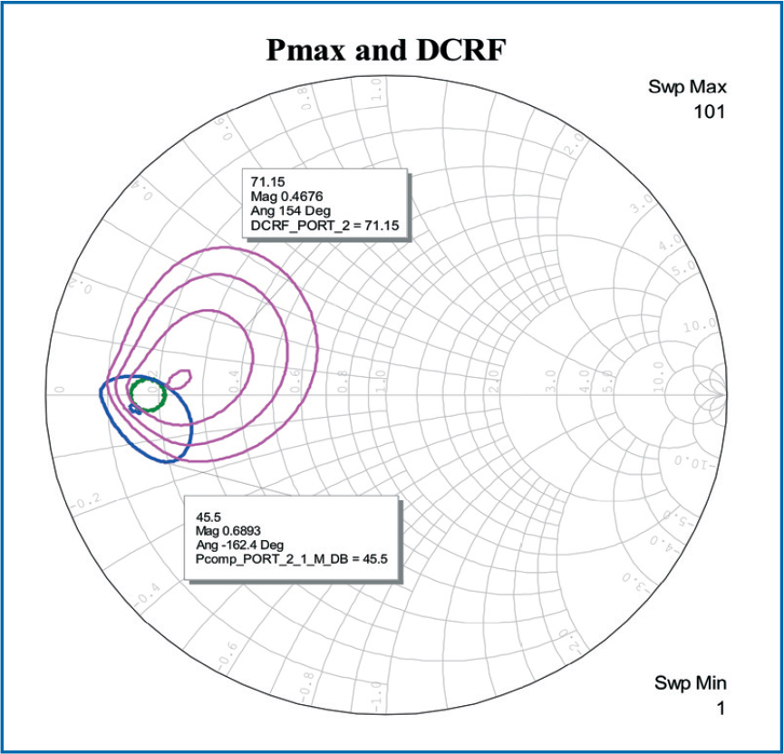 - Figure 7: The load-pull contours of the fundamental frequency for maximum power (blue) and drain efficiency (magenta) have been plotted in the same Smith chart. The green circle defines the region of mutually acceptable power and efficiency