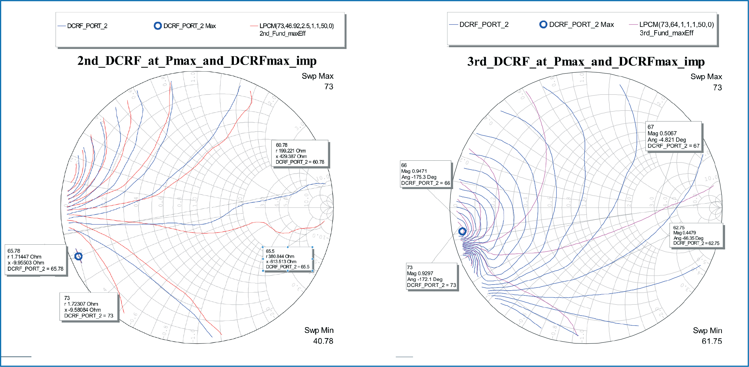 - Figure 8: Left – Plot of load-pull contours for the second harmonic frequency at the fundamental impedances for maximum power and drain efficiency. The acceptable region is below the drawn line. Right – Plot of load-pull contours for the third harmonic frequency at the fundamental impedances for maximum power and drain efficiency. The acceptable region is above the drawn line