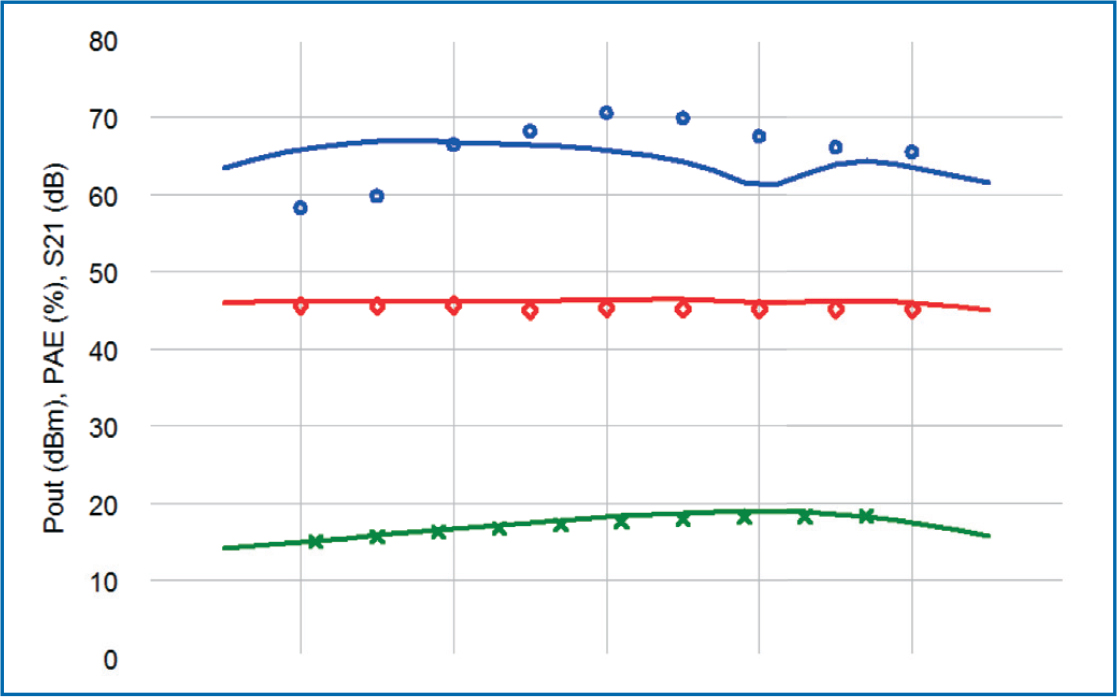 - Figure 15: Simulated versus measured output power (red), PAE (blue), and S21 (green). Lines show simulated performance; symbols show measured data