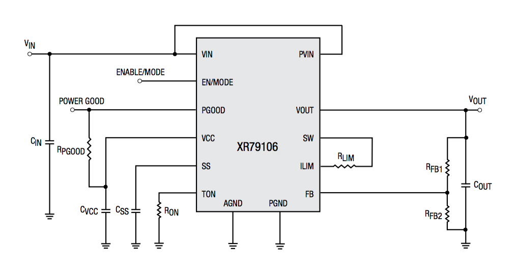 Implemented as synchronous step-down buck converters, these power modules employ a proprietary emulated current-mode Constant On-Time (COT) control loop. They require no external loop compensation and are unconditionally stable using ceramic output capacitors and operate at near-constant switching frequency, requiring very few external housekeeping components. The wide input voltage range allows the XR79103/06 to operate from industry standard 5V, 12V and 19.6V rails while the XR79203/06 can cope with standard 24V and 18-36V DC rails, and also rectified 18VAC and 24VAC rails.