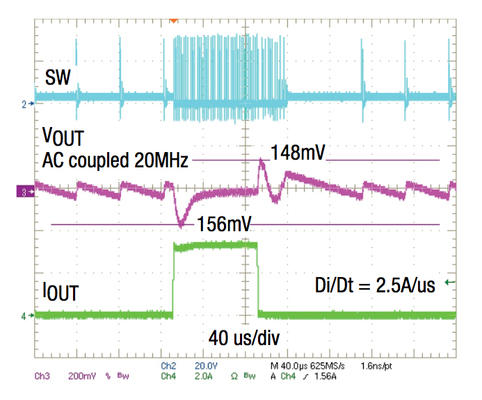 - Figure 6. The XR79206 executes a load step from 0.05A to 3A by seamlessly changing from DCM to CCM