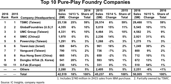 The three top-10 pure-play foundry companies that displayed the highest growth rates in 2016 were X Fab (54%), which specializes in analog, mixed-signal, and high-voltage devices and acquired pure-play foundry Altis in 3Q16 to move into the top 10 for the first time, China-based SMIC (31%), and analog and mixed-signal specialist foundry TowerJazz (30%). In contrast to X-Fab’s 2016 growth spurt, TowerJazz and SMIC have been on a very strong growth curve over the past few years. TowerJazz went from $505 million in sales in 2013 to $1,249 million in 2016 (a 35% CAGR) while SMIC more than doubled its revenue from 2011 ($1,220 million) to 2016 ($2,921 million) and registered a 19% CAGR over this five-year timeperiod.