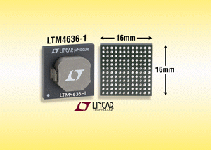 LTM4636-1, a 40A to 240A scalable step-down µModule switching regulator. The part incorporates protection circuitry that trips a circuit breaker in the event of overvoltage or overtemperature fault conditions to protect itself, the PCB and loads such as high current low voltage processors, FPGAs, GPUs and ASICs. An output crowbar function quickly clamps the output to protect the load during an overvoltage condition. The LTM4636-1 benefits from an innovative BGA package construction in which the inductor is exposed on top and is used as a heat sink, permitting direct contact with airflow from any direction for more effective cooling.