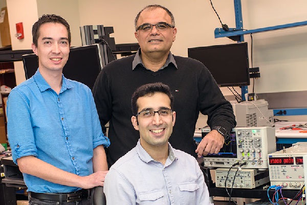 Research scientist Dr. Anthony Fowler (left), mechanical engineering professor Dr. Reza Moheimani and research associate Dr. Mohammad Maroufi (seated) created an atomic force microscope on a chip in the Laboratory for Dynamics and Control of Nanosystems in the Erik Jonsson School of Engineering and Computer Science.