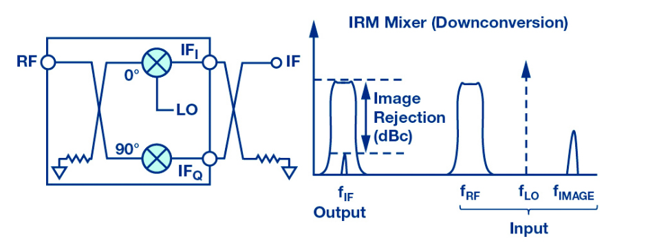 The IQ mixer is a type of passive mixer. It offers the same advantages as regular passive mixers, plus the additional advantage of eliminating unwanted image signals without any external filtering. These mixers are also referred to as IRM (Image-Rejection Mixers) when used as a downconverter and SSB (Single Sideband mixer) when used as an upconverter. The IQ mixer is built from two double balanced mixers, and a LO signal that is split into two and then phase shifted 90 degrees apart (0° to one mixer and 90° to the second mixer). This shift in phase allows the mixer to generate only one sideband (desired) signal and reject the unwanted signal.
