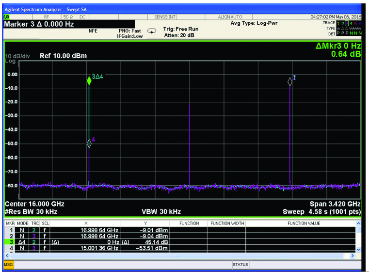 The spectrum chart in Figure 2 shows the performance of an IQ mixer (purple line) and double balanced mixer (blue line) on the same chart. As one can see, the IQ mixer rejects the unwanted lower sideband, by offering a 45 dB rejection, compared to a double balanced mixer that produces both upper and lower sideband.