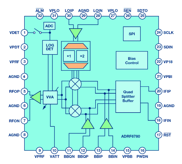 As a result, most OEMs now expect one common frequency mixing platform to cover multiple radio bands and providing the best performance and economies of scale. Analog Devices’ industry-leading ADRF6780 (6 GHz to 24 GHz I/Q modulator) is a step in this direction. Using a single I/Q modulator OEMs can now design the entire up-conversion portion of the microwave backhaul radios for nine different radio bands between 6 and 24 GHz. As shown in Figure 4, the ADRF6780 integrate an I/Q mixer, selectable LO multiplier, a VVA, a log detector and an SPI programmable quad split buffer in the same package. This device offers OEMs the flexibility to either use it in traditional heterodyne architectures with IF of 0.8–3.5 GHz and eliminate individual components or in a direct conversion (zero IF architecture) that goes all the way from baseband all the way up to RF with just one part. The integrated LO doubler and buffer reduces the need for high input frequency and power. The device also includes VVA gain control to provide a constant output gain when needed. All the functionality in the part related to gain settings, sideband rejection, calibration, etc., can be controlled by the SPI and makes the user control easy to use.