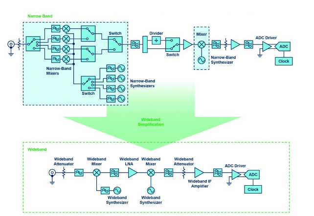 The test and measurement (T&M) instrumentation and military markets have always had a very distinct need for wideband performance. Most applications in these markets, such as electronic warfare, radar, spectrum analyzer etc., are highly customized and require extremely good signal integrity and accuracy. These applications usually also span across a wide spectrum of frequency bands (wideband requirement) and need the ability to detect very low fidelity signals (low noise figure and high linearity).
