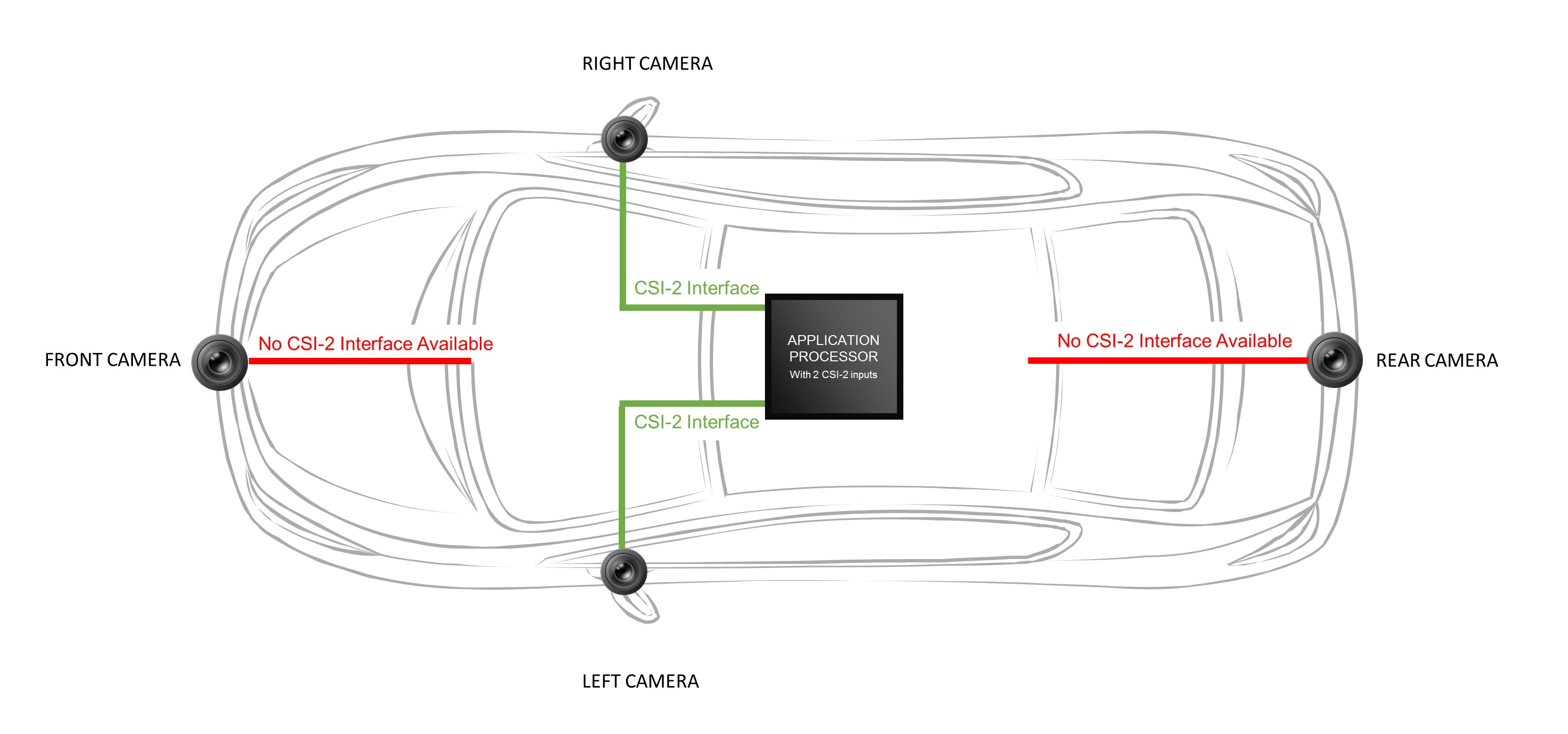As the number of cameras and screens connected to the AIS has proliferated, it has become harder to adapt the mobile processor platforms to these systems. Most smartphones have two cameras, a primary rear-facing camera, and a front-facing camera for videoconferencing. But when applied to the car space, with its multiple cameras, the two inputs available are insufficient.
