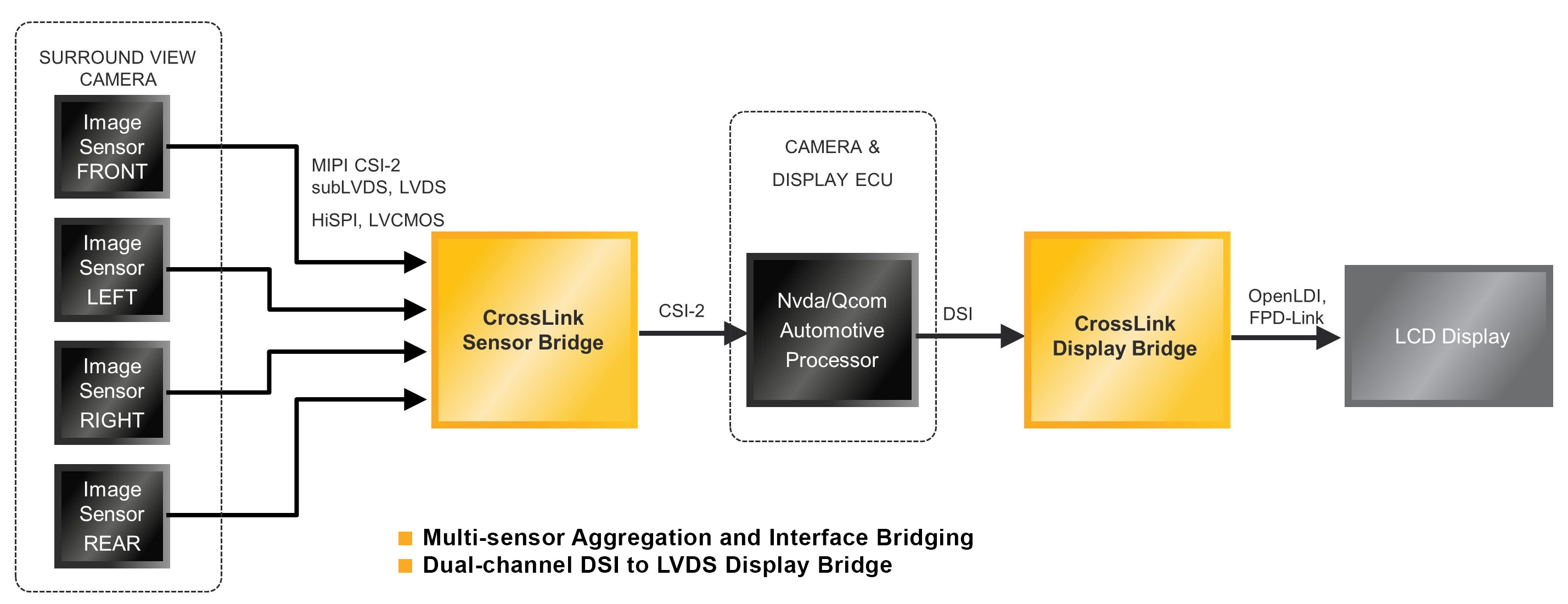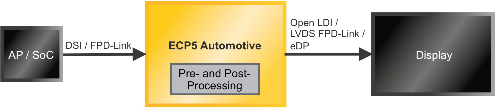 ECP5 FPGAs are a mixed interface bridge can serve as a video bridge between the mobile application processor’s DSI or FPD-Link output, and the LVDS or embedded DisplayPort (eDP) input of most automotive displays.