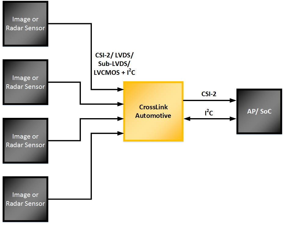 As in the infotainment space, CrossLink provides low power, low cost, sensor and camera interface bridging. This allows data from multiple image sensors to be aggregated and delivered via Crosslink to the AP via a single CSI-2 interface. The small footprint of CrossLink allows it to be placed closer to the sensor adding flexibility to manufacturing design.